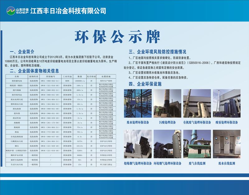江西豐日冶金科技有限公司成立于2012年3月,注冊(cè)資金15000萬(wàn)元,現(xiàn)為山東環(huán)保集團(tuán)旗下控股子公司,落戶(hù)于江西省宜春市袁州醫(yī)藥工業(yè)園。公司年回收再生十萬(wàn)噸廢舊鉛酸蓄電池項(xiàng)目占地62.41畝,總建筑面積42180㎡,總投資3.5億元,于2020年5月份投入生產(chǎn),自生產(chǎn)以來(lái)運(yùn)行穩(wěn)定,年產(chǎn)值達(dá)10億元以上,年納稅1億元以上。